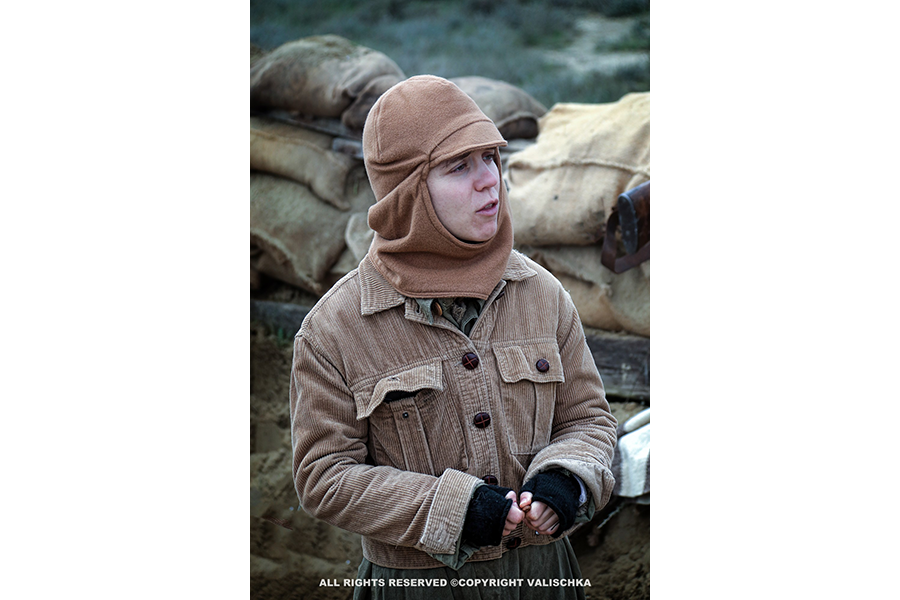 Alejada del estereotipo de miliciana con buzo azul y gorrillo del comienzo de la guerra, nuestra compañera viste como cualquier combatiente del EPR. Para protegerse del frío, por encima del mono kaki lleva una cazadora de pana, un capote y en la cabeza un gorro pasamontañas de paño marrón que se hizo tan popular entre los defensores de Madrid durante el invierno de 1936 a 1937. Como equipo de combate lleva un corrreaje de tipo carniago, un casco francés Adrian M1926 y una carabina de caballería Mannlicher M1895. Se trata de un arma de origen austriaco de pequeñas dimensiones y menos pesada que su versión fusil, por lo que parece una buena decisión para llevarla encima durante las largas marchas de aproximación a Brihuega.