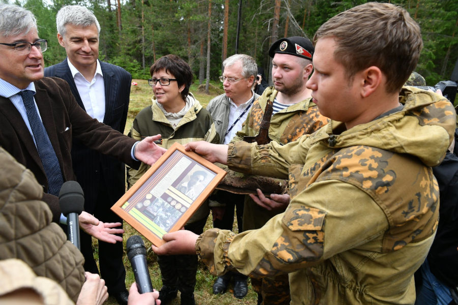 24 de junio de 2018, durante la inauguración del memorial de Syandeba Andrey Suchkov, del grupo de búsqueda Patriot, entrega los objetos personales de Martín Peña al embajador español en Rusia, Ignacio Ybáñez Rubio (Сяндеба. Помнить поименно).