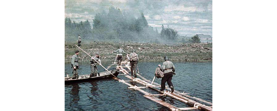 Soldados finlandeses cruzando un río en Olonets en el verano de 1941. La resistencia de la 3ª LDNO en esta zona bloqueó el avance enemigo, afrontando fuerzas superiores a costa de muchas bajas desde primeros de agosto. Hicieron falta dos divisiones finlandesas para que fuese cercada en Nurmolitsa a comienzos de septiembre y aun así logró forzarlo, retirándose hacia Petrozavodsk, donde sería finalmente aniquilada (Foto | Finlandia. El ejército durante la guerra. Parte 1 - Página 4 - Todo sobre la Segunda Guerra Mundial).